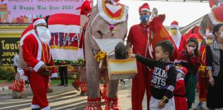 Santa rides elephants to Thai town, bearing gifts of face masks